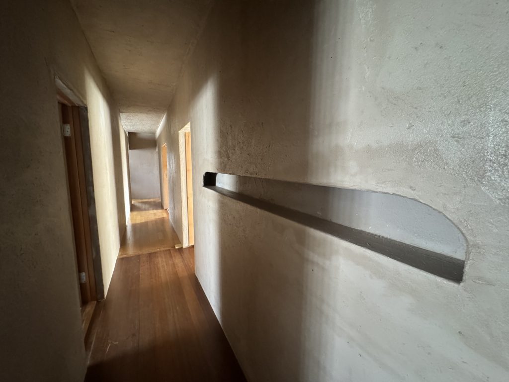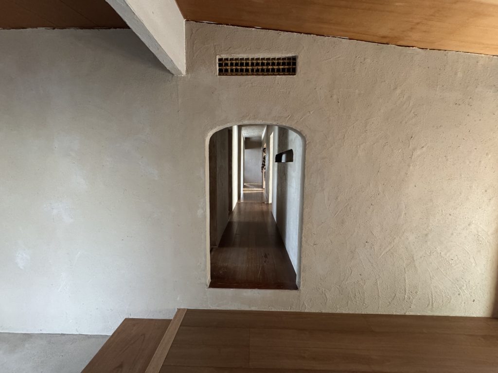 入口のアール、そして造作された廊下の壁、わびさび感じる玄関ホール。細部までおしゃれに作られたその空間には、どこかしら温かさを感じます。
