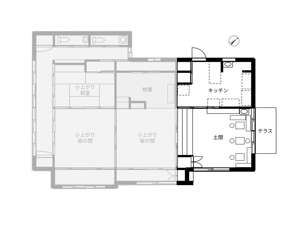 利用可能スペース: 入口からすぐの土間スペース、キッチン、テラス